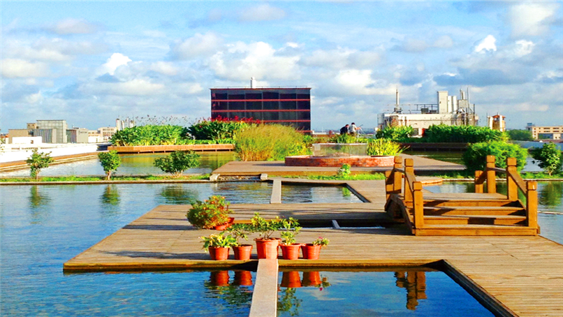 全園廢水回收、物理深度過濾、植物生態凈化、三級遞進處理、達到直飲標準、修復環境水質,開能健康努力打造綠色生態園區。