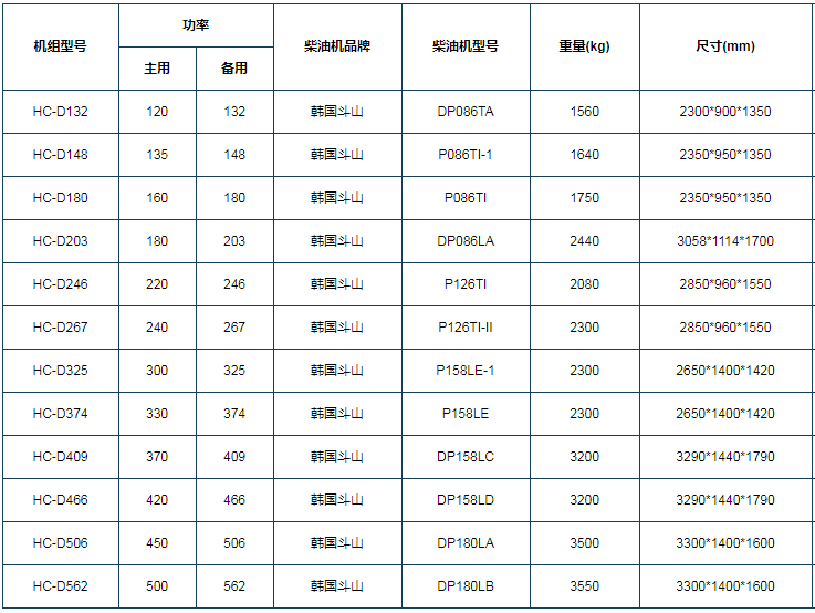 韩国斗山柴油发电机组(DOOSAN DAEWOO)涡轮增压、中冷进气、噪音低、排放***良涡轮增压、中冷进气,符合ISO046标准重量轻、抗突加负载能力强、性能稳定、结构紧凑、功率大。本公司与韩国斗山大力合作,联合向国内外推出斗山系列柴油发电机组功率范围50KW-650KW。